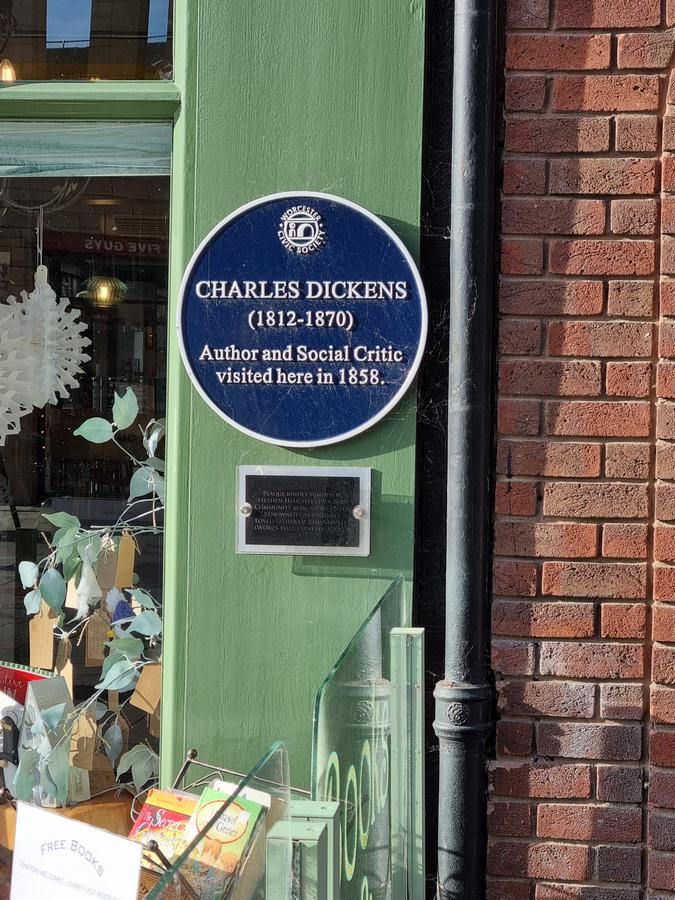 Dickens, Charles Plaque for Charles Dickens on High Street, Worcester, Worcestershire. He stayed here at the Swan Hotel on 11 August 1858.Picture by Androom (13 Nov 2025)